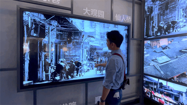 城市標識看似是將顯示屏幕一分為二,但隨著工作人員手指一動,兩側便會緩緩推出兩塊小屏幕,繼而形成一整塊大屏,為參觀者提供了一份絕佳的觀影體驗。